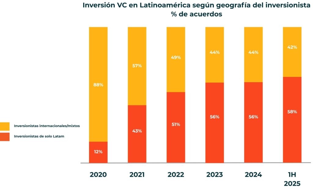 Este reporte también reporta un leve incremento en inversión early stage (de 40% en 2020 a 59% para la primera mitad del 2025) del total de dinero invertido. También aumentó la inversión por parte de fondos locales (de 12% en 2020 a 58% para la primera mitad del 2025).
